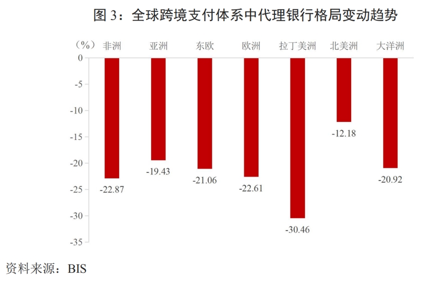 中国银行研究院2022年发布的《全球跨境支付特征、问题及前景》一文援引SWIFT数据指出,2011年至2018年,全球跨境支付领域的活跃代理银行数量下降了20%。其中,传统金融发达的北美洲,代理银行数量下降最少,降幅仅为7.35;而金融业基础相对薄弱的拉丁美洲和非洲,代理银行数量的下降趋势则更加明显,分别达到了30.46%和22.87%。