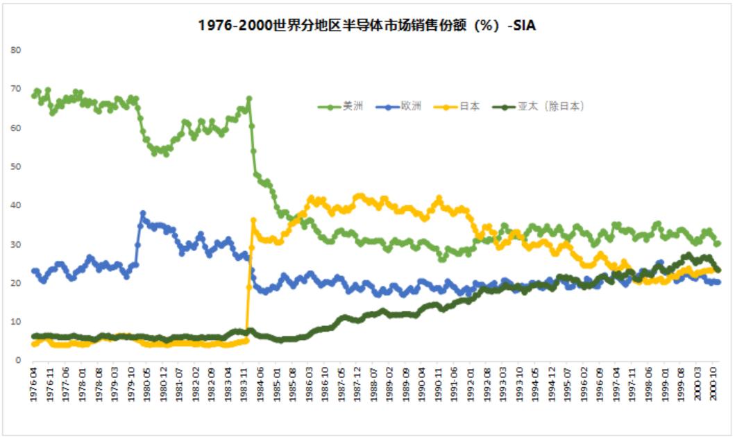 1976年,日本的VLSI计划实施,重点攻关先进内存制程和半导体设备,到1984年终于开花结果,这一年日本DRAM产业进入技术爆发期。通产省电子所研制成功1M DRAM,三菱公开展出4M DRAM的关键技术,日立生产的DRAM内存,已经开始采用1.5微米生产工艺,这些都将同时代的美国远远甩在身后。也就是在这一年,日本的半导体销售份额直接从不到10%提升到超过30%。