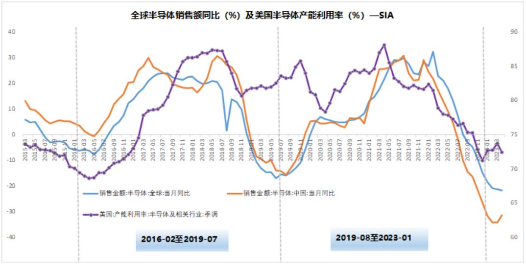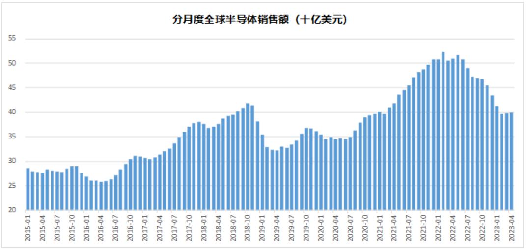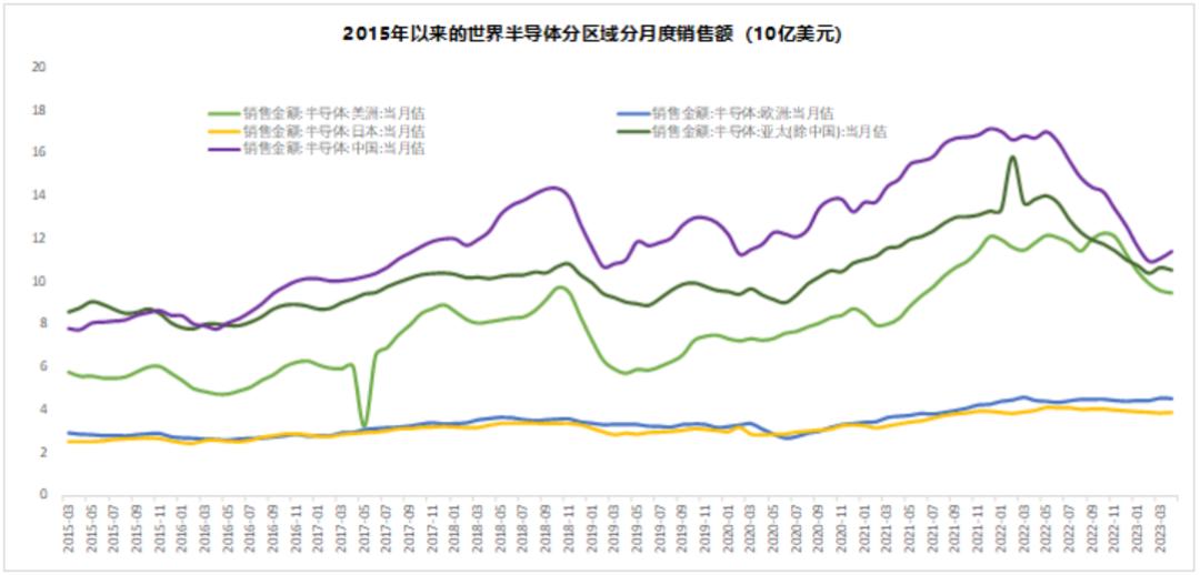 全球半导体销售额同比增速的低点,最近一次出现在2019年6月,同比下滑16.8%;随后就开始了一路向上,高点出现在2022年2月,同比增长32.4%;短暂震荡之后就一路向下,到2023年4月,同比下滑21.6%。