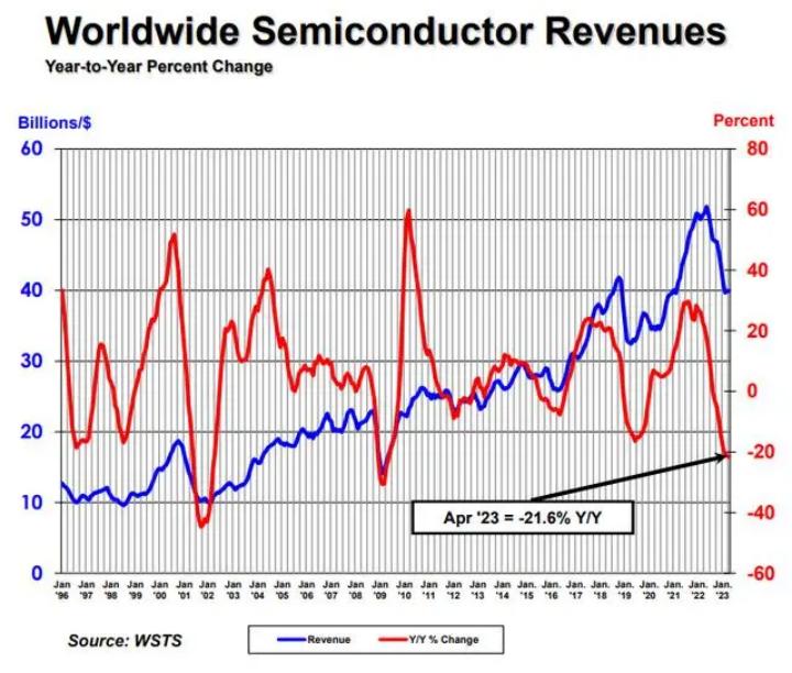 如果这一次的半导体周期从2019年6月份开始,截至2023年4月,已经过去了46个月。按照以往半导体行业42个月的周期,下一波的周期已经开始。也就是说正常情况下市场已经向上了,但是这个同比增速怎么看都不像已经到底了的样子。