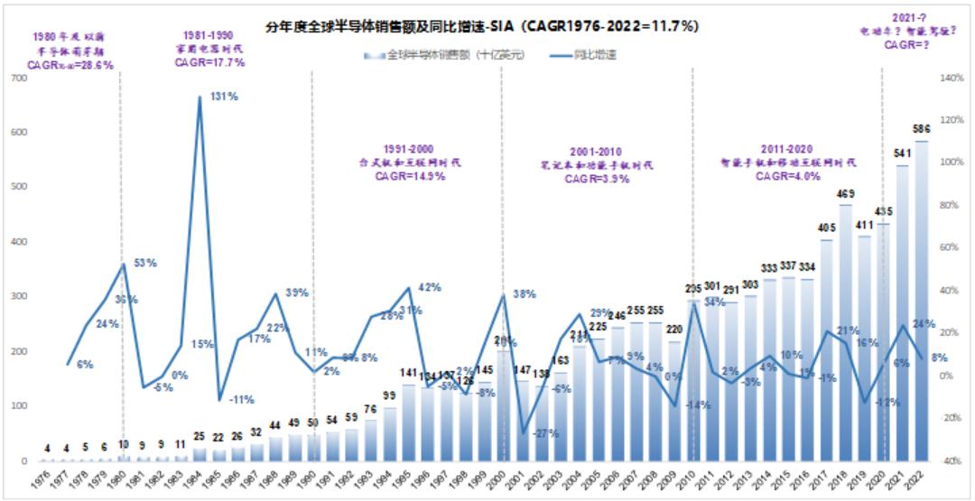 全球半导体行业从1976年一直到2022年,销售额的年化增速是11.7%,看上去增速不低,但高增长阶段出现在2000年之前,那个时候还可以称为“高成长,弱周期”,2000年之后,全球半导体年销售的增速就回到了4%左右,只略高于全球GDP增速,半导体行业就成为典型的“低成长,强周期”。