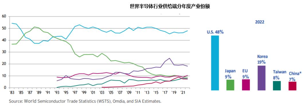 今天的全球半导体行业,跟90年代的全球半导体行业,属实是攻守异位。美国跟当年的日本所处的境遇,实际是一样的。国小而不处卑,力少而不畏强,无礼而侮大邻,贪愎而拙交者,可亡也。日本的半导体产业份额从1988年的50.3%回落到2022年的9%,用了30多年的时间,美国现在看应该用不了这么久了。