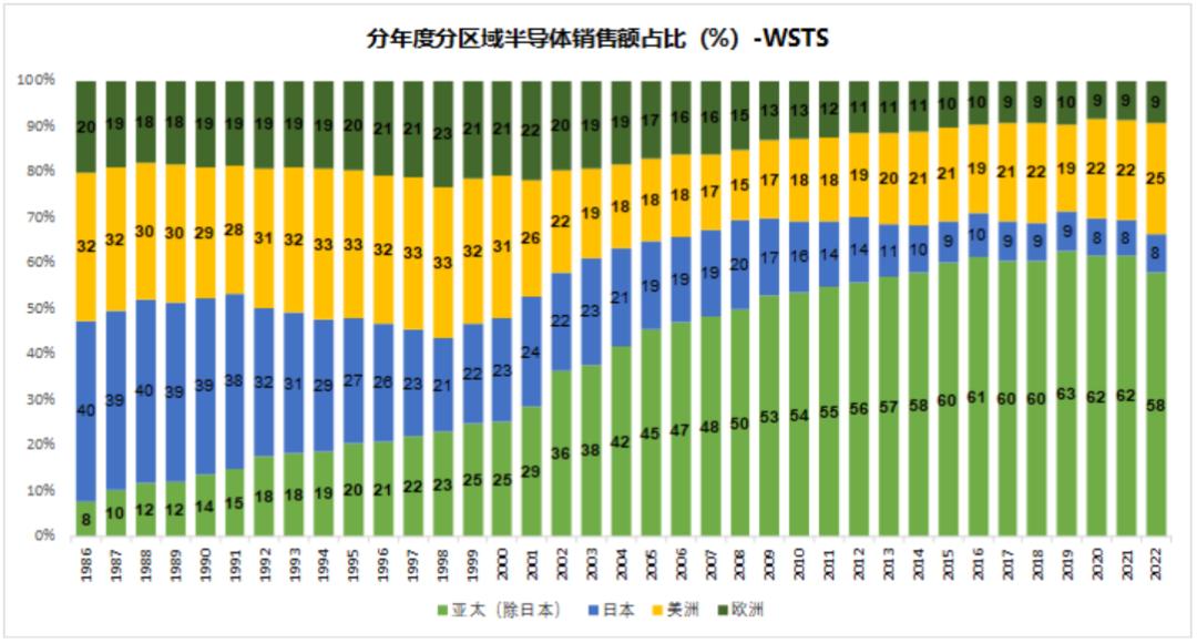 单从WSTS的数据上看,从2001年起,包含中国在内的除日本之外的亚太地区,半导体销售额就已经超过了美洲,2010年,除日本之外的亚太地区,半导体销售额已经是美洲的三倍了。