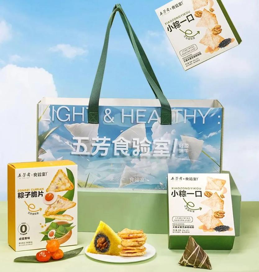 不仅如此,今年5月份,借势消费者对健康消费的追求, 五芳斋 联合健康零食品牌 食验室 推出“轻盈端午礼盒”。据介绍,礼盒内含大黄米黑芝麻核桃粽和咸蛋黄口味粽子脆片两盒产品。其中,大黄米黑芝麻核桃粽选用100%东北大黄米,加入芝麻和核桃仁;粽子脆片采用0油蛋白膨化工艺,咸香酥脆。