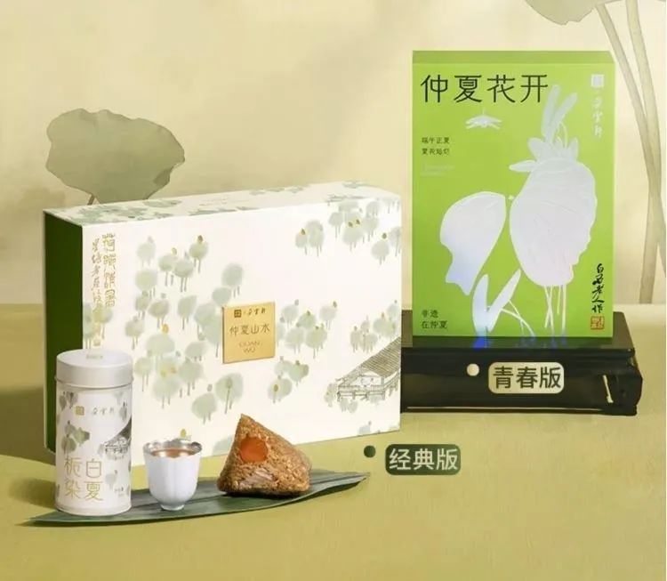 此路不通,不如另辟他径。今年,奈雪的茶决定从国潮入手,和朵云轩跨界寻找灵感。其新推的“非遗仲夏花开山水端午”礼盒,以齐白石的画为视觉灵感,并配以白茶,试图把粽子打造成中式茶点。