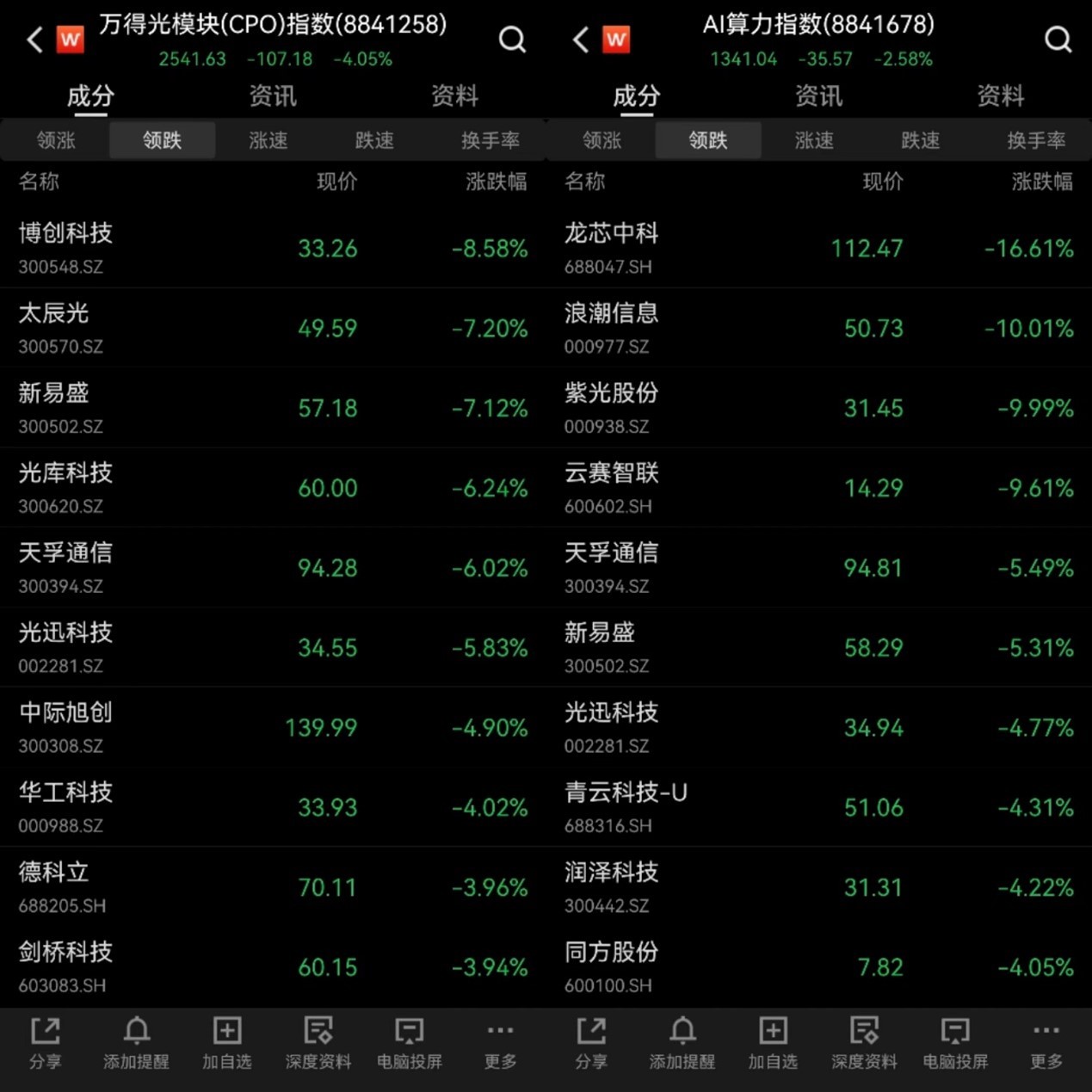 AI概念股继续下挫,CPO、算力、ChatGPT等方向领跌,浪潮信息、云赛智联、紫光股份、恒为科技等多股跌停,龙芯中科跌超15%,博创科技、拓尔思跌超10%,云从科技、拓尔思、零点有数、大华股份、东晶电子等近20股跌超7%,海天瑞声、光云科技、软通动力、三六零、科大讯飞等均跌超5%。