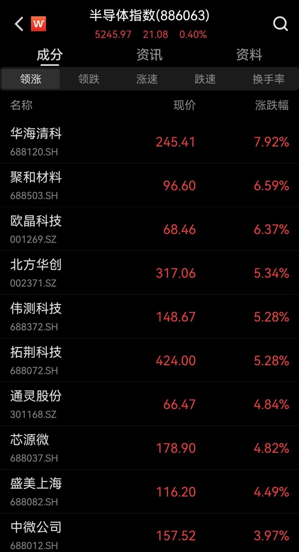 有消息称,美国正在考虑对人工智能芯片出口采取新的限制。受此消息影响,英伟达盘后跌超3%。国内半导体板块则持续回升,华海清科大涨8%,北方华创、伟测科技涨超5%,正帆科技、拓荆科技、中微公司、盛美上海等快速跟涨。