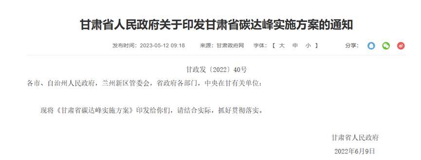 5月,甘肃省人民政府发布《关于甘肃省碳达峰实施方案的通知》。《通知》指出,到2030年,力争全省新能源装机容量突破1.3亿千瓦。大力发展新能源。全面推进风电、太阳能发电大规模开发和高质量发展。持续推进酒泉千万千瓦级风电基地向特大型风光电基地迈进,打造金(昌)张(掖)武(威)千万千瓦级风光电基地。