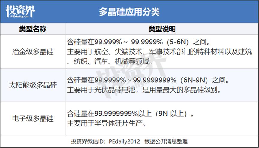 其中,多晶硅作为以工业硅为原料提纯后达到一定纯度的硅材料,起到了优秀的中间品作用。多晶硅根据纯度的不同可分为冶金级、太阳能级以及电子级。