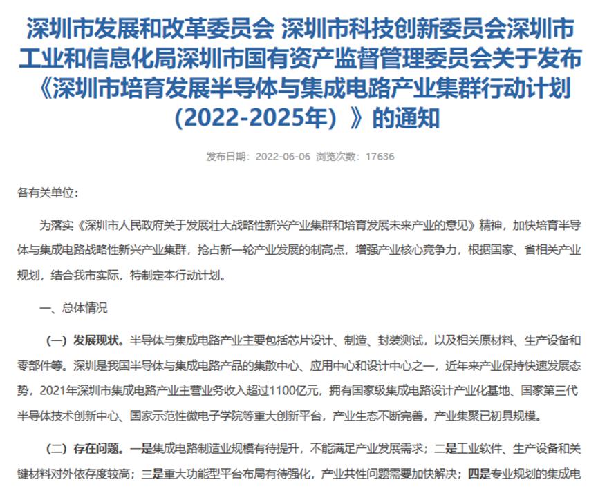 去年6月,深圳发布《深圳市培育发展半导体与集成电路产业集群行动计划(2022-2025年)》,指出到2025年,建成具有影响力的半导体与集成电路产业集群,产业规模大幅增长,制造、封测等关键环节达到国内领先水平。