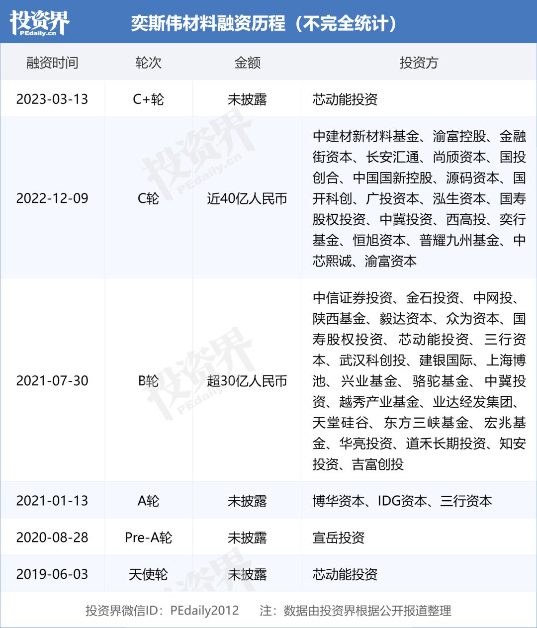 成立至今,公司已完成4轮融资,背后集结了三行资本、同创伟业、创东方投资、建银国际、金浦投资、浦东新产投、中建投资本、武岳峰科创、中建材新材料基金,中车资本、浦东科创、成都科创投集团、元禾厚望等等。