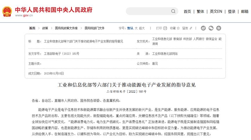 今年1月,工业和信息化部等六部门发布《关于推动能源电子产业发展的指导意见》,为统筹推动现代信息和能源技术、光伏和储能等深度融合,《指导意见》提出三大专项行动,分别侧重发挥太阳能光伏作为新能源生产主力军、新型储能产品作为新能源系统压舱石、关键信息技术作为新能源前进发动机的作用。