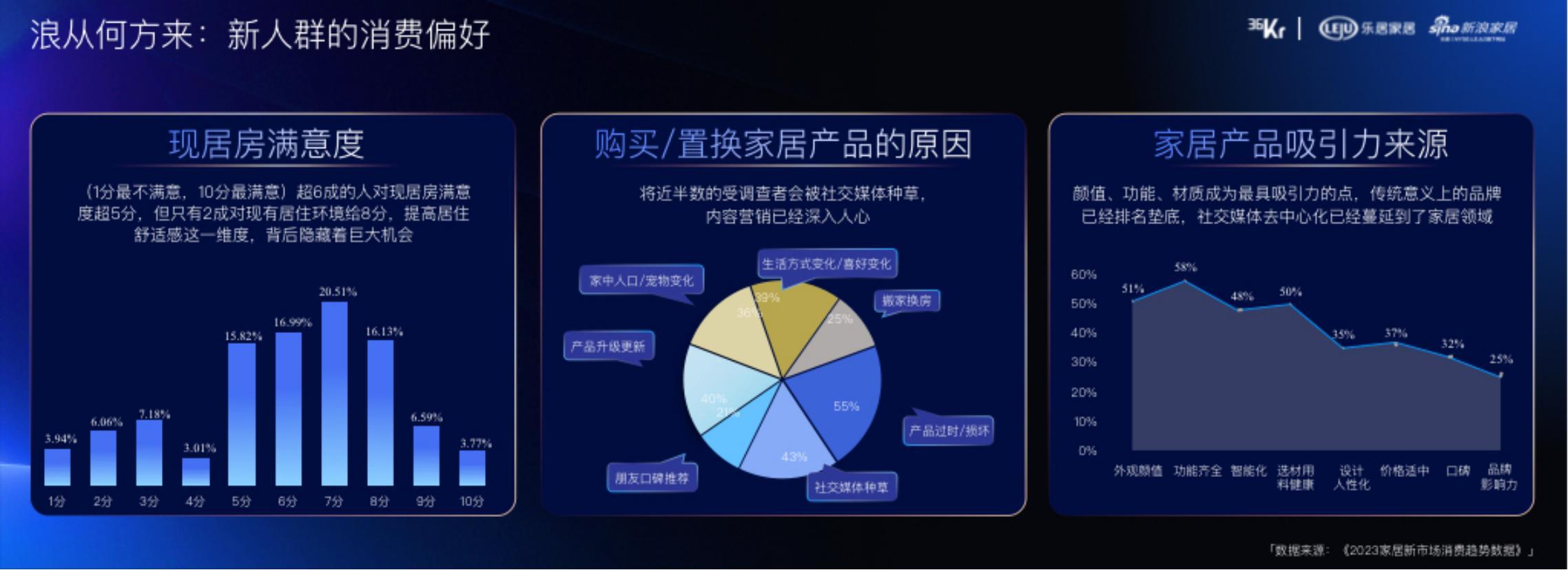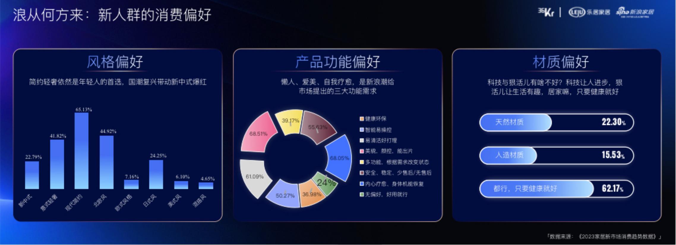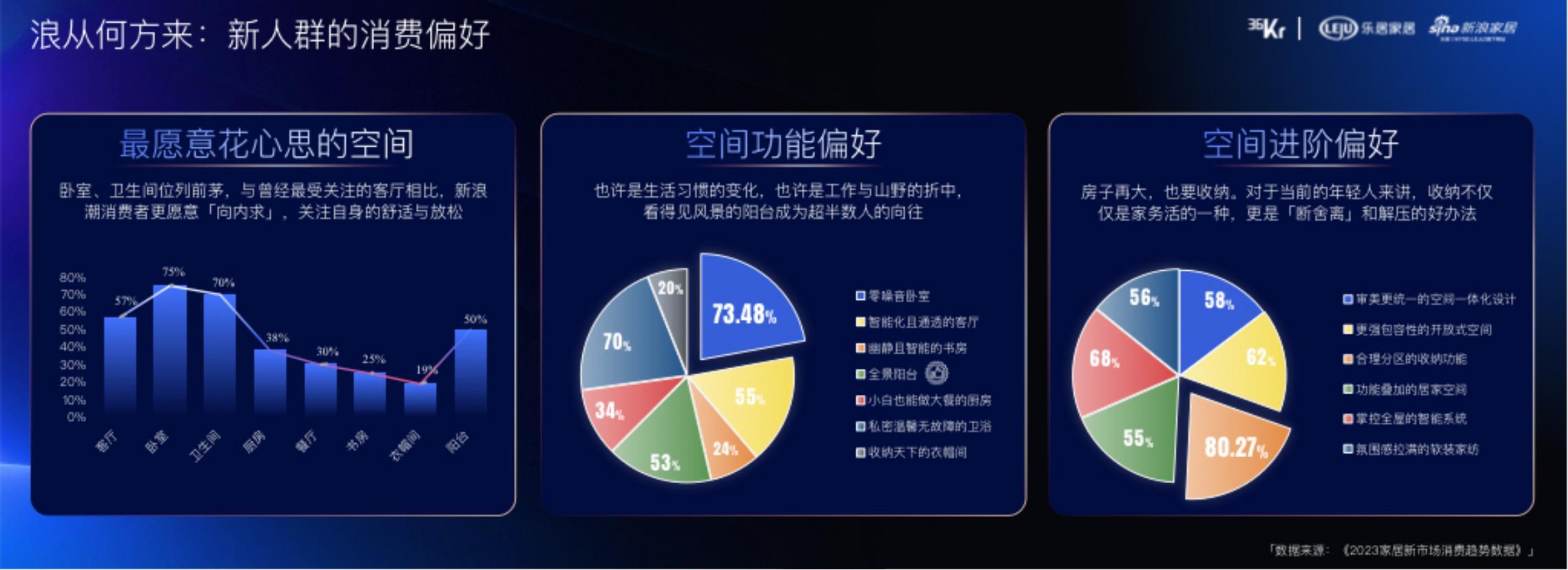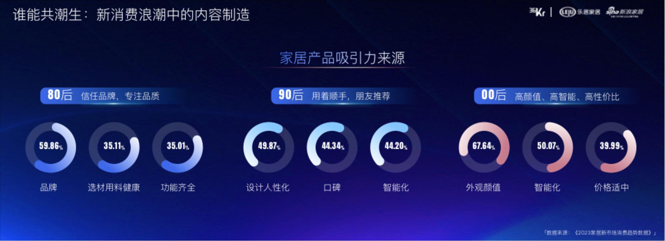 2023年6月,由36氪和新浪家居合作推出的《2023家居新市场消费趋势数据》在第23届成都国际家具展上正式发布。基于问卷调查,《2023家居新市场消费趋势数据》围绕80后、90后、00后的消费偏好、内容营销与信息接受偏好进行了介绍及分析。