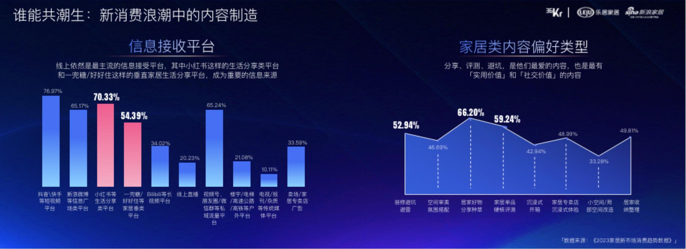 线上依然是最主流的信息接受平台,其中小红书(70.33%)这样的生活分享类平台和一兜糖/好好住(54.39%)这样的垂直家居生活分享平台,成为重要的信息来源。而在家居类垂内容方面,消费者更偏好“分享”(66.20%)“评测”(59.24%)“避坑”(52.94%),这类最具「实用价值」和「社交价值」的内容。