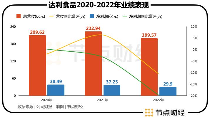 达利食品的烦恼,从财务报表上就可以看出端倪。2020年至2022年这三年,公司营收分别为209.62亿元、222.94亿元和199.57亿元,增速分别为-1.93%、6.35%、-10.5%,同期净利润分别为38.49亿元、37.25亿元和29.90亿元,增速分别为0.21%、-3.22%、-19.73%。
