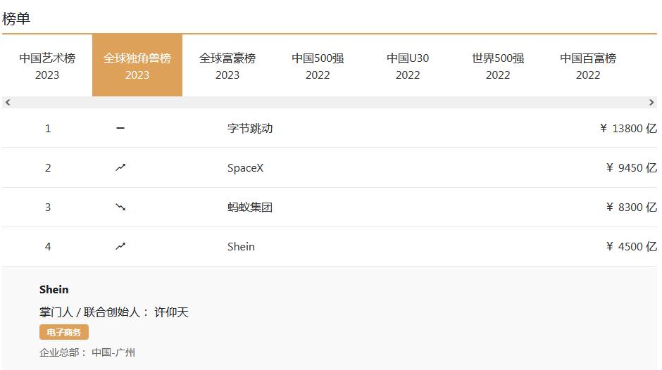 2023年5月,在最新一轮融资中筹得20亿美元的SHEIN估值虽然已经降至一年前的2/3,但600多亿美元的估值还是能让他在全球独角兽排名中位列第四,仅次于字节跳动、SpaceX和蚂蚁集团。