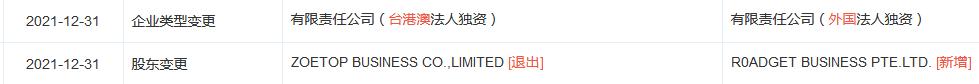 天眼查显示,2021年12月31日,SHEIN的中国主体公司“广州希音国际进出口有限公司”的股东就已经由香港公司ZOETOP BUSINESS CO.,LIMITED变更为新加坡公司R0ADGET BUSINESS PTE.LTD.。