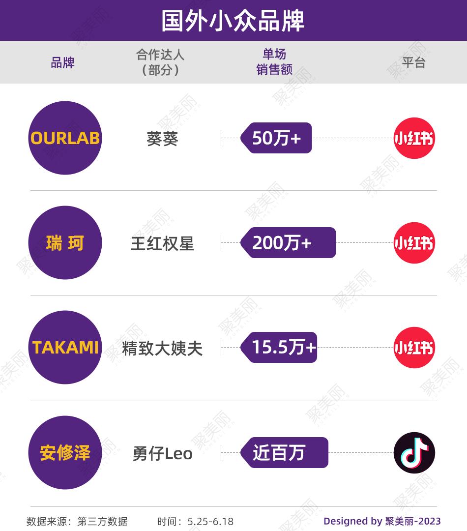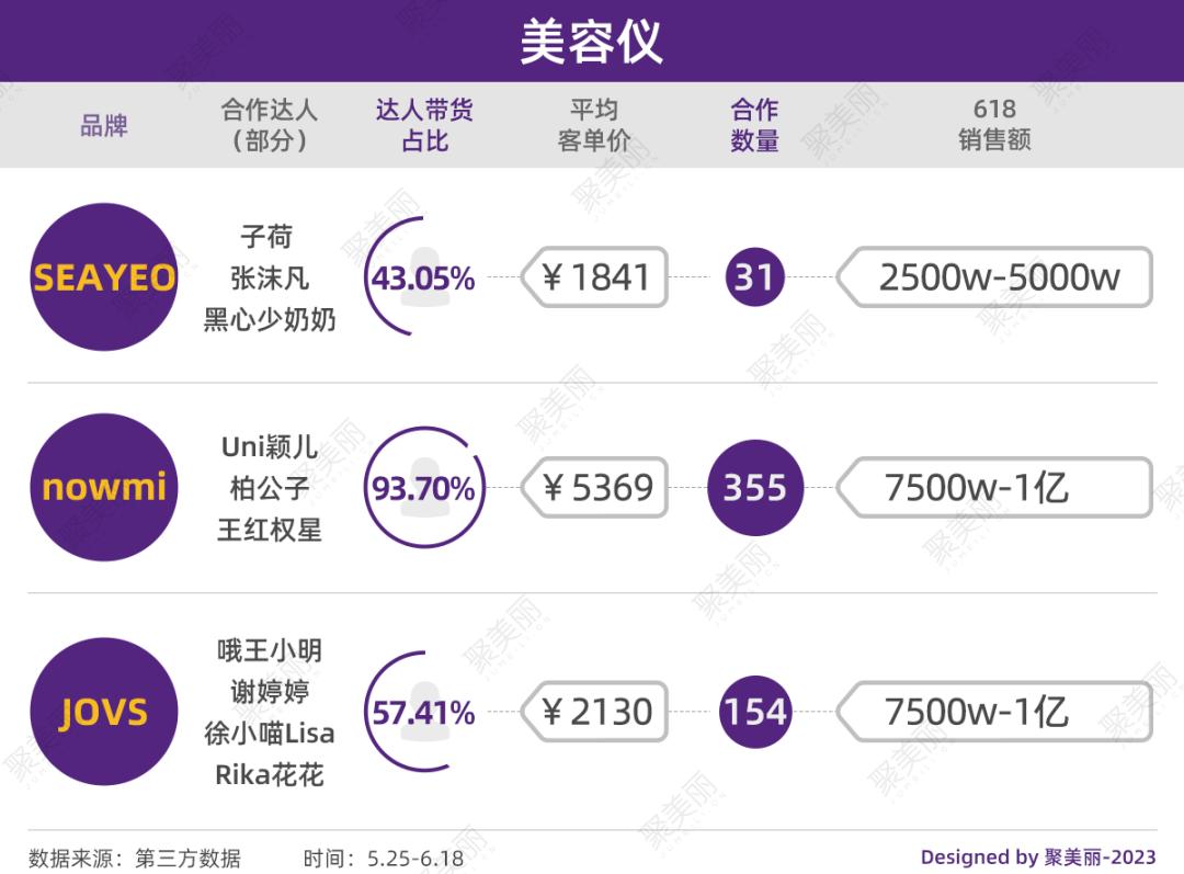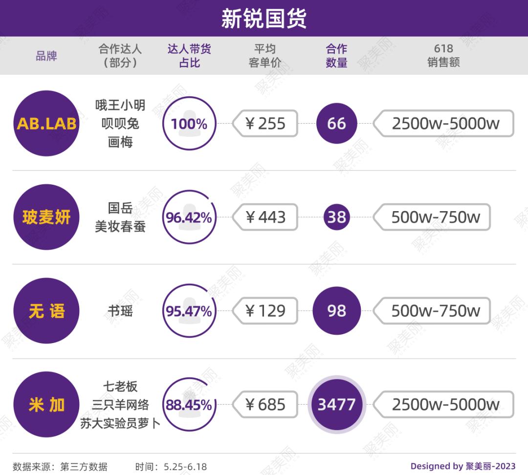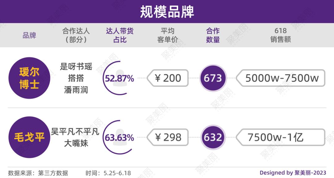 因此,聚美丽通过分析规模品牌、新锐国货、外资小众等不同规模、特点的品牌类型,以及美容仪器等不同赛道,分别盘点了他们今年618与优质的达人合作案例代表。