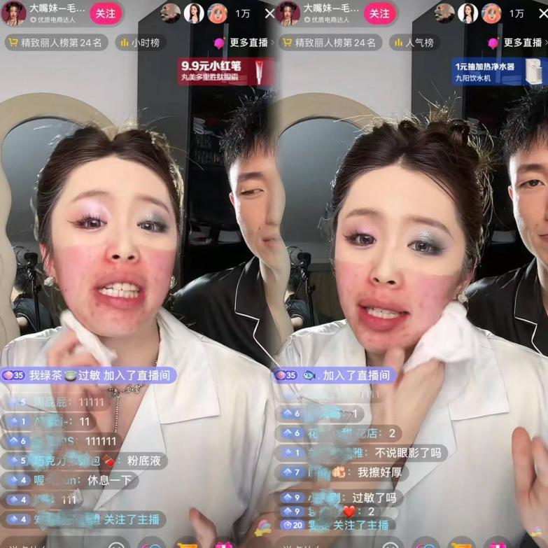 如自称外油内干敏感肌的大嘴妹,在直播间中通过不断擦拭掉下半边脸的底妆,再上妆的循环方式,在种草毛戈平底妆产品遮瑕力强的同时,也提高了直播间的评论互动率。