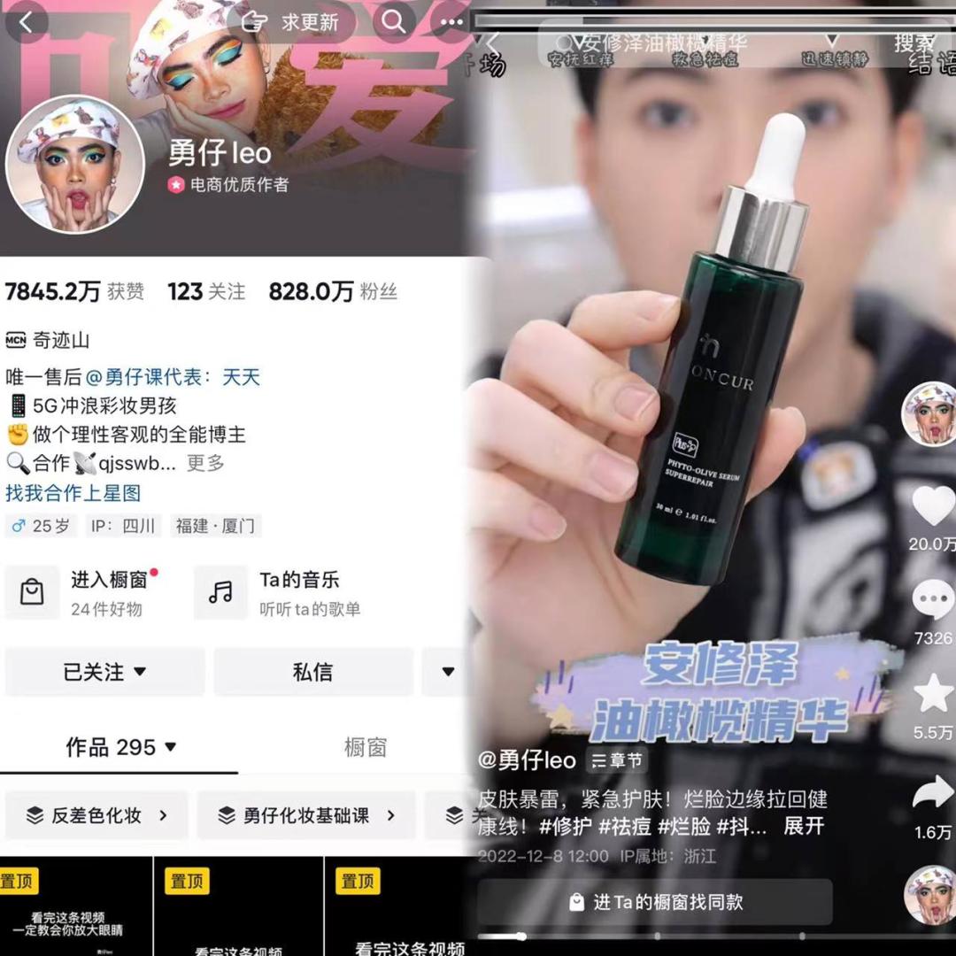 奇迹山旗下的头部美妆博主勇仔Leo,则在5月份的抖音直播中,为安修泽油橄榄精华带来了近百万的销售额。