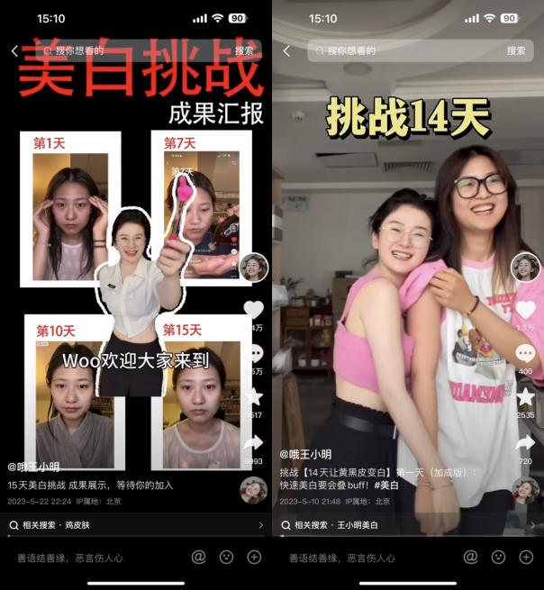 这与哦王小明该达人在直播、短视频的内容输出上都紧扣“美白”标签,并以“美白一姐”作直播间标题深化个人符号息息相关。譬如其短视频围绕“美白”创作的“15天美白挑战”,也从很大程度上为产品进行了前置种草。