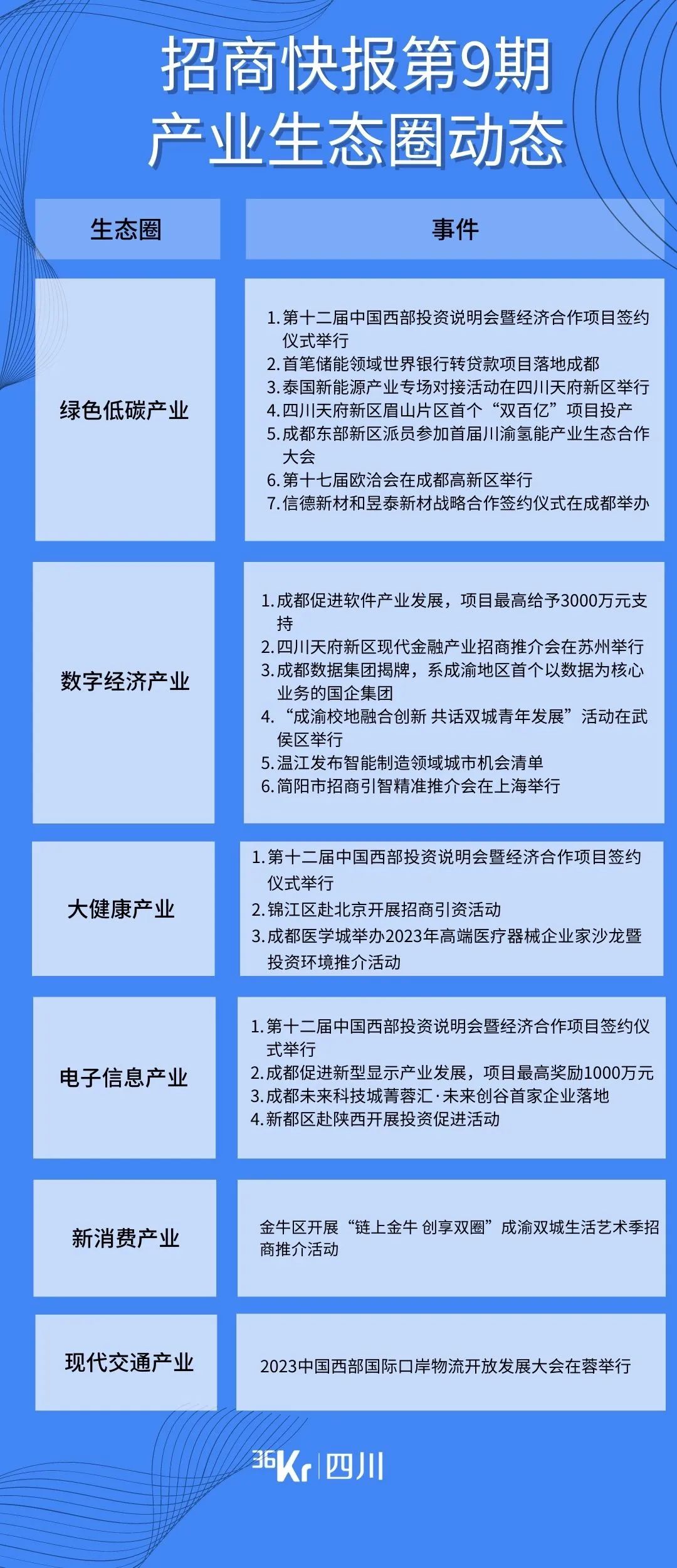 2023年7月6日,36氪四川通过公开渠道,共收录6月29日—7月6日成都市23个区(市)县相关的招商资讯、政策信息20条。