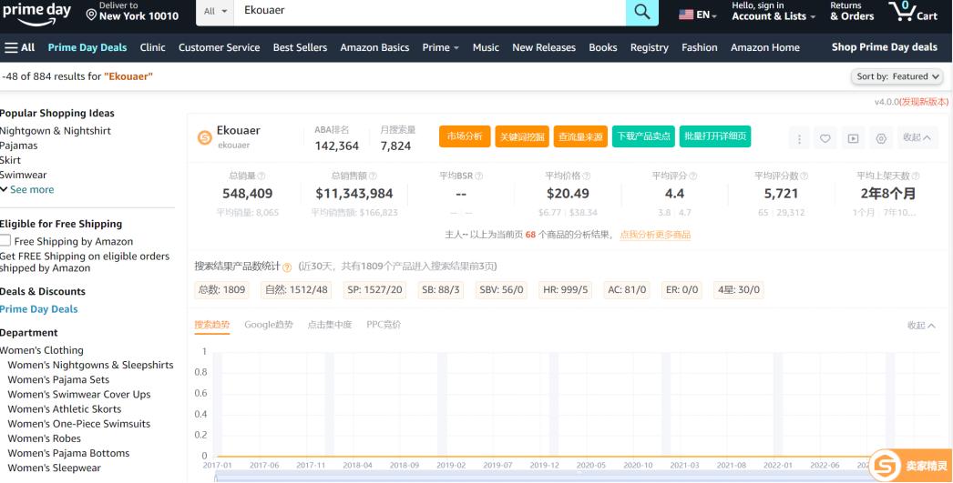 另卖家精灵www.sellersprite.com数据显示,赛维另一主打品牌Ekouaer的总销量为54.84万,总销售为1134.3万美元,平均售价为20.49美元。
