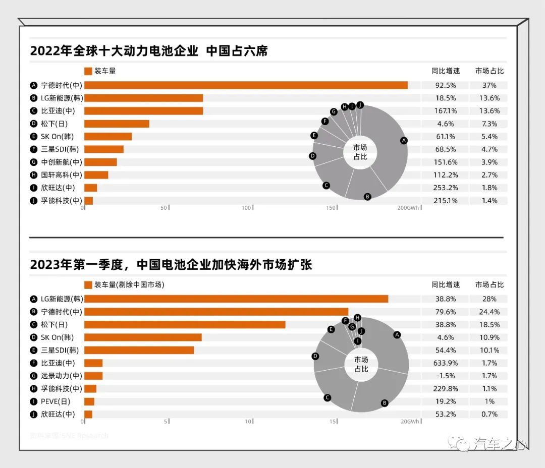 在海外市场销量排名中,2023 年一季度,宁德时代市场份额达到 24.4%,排名超越松下,升至第二;LG 新能源市场份额降至 28%,排名第一。二者差距减小。