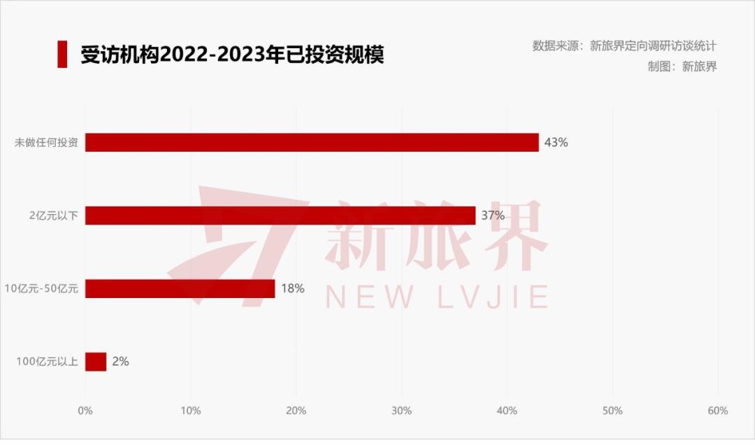在这样的大背景下,文旅企业对投资非常谨慎。 近日,新旅界在调研访谈2022-2023年度中国文旅产业投融资情况时发现,目前参与访谈的旅企超40%在2022年未做投资,约1/3在2023年暂无投资计划,以消化存量与观望市场为主。