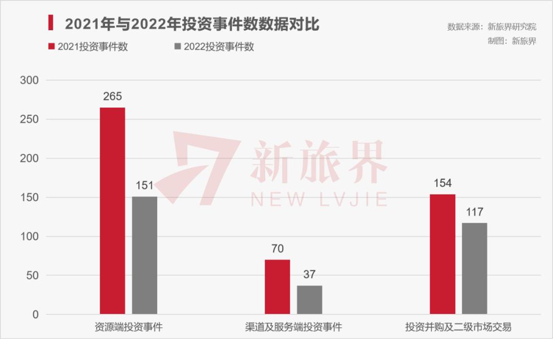 2022年,新旅界研究院统计到的投资事件数总计305起,仅是2021年489起的60%。 其中,重资产资源端投资事件151起,为2021年的约57%; 渠道及服务端投资事件37起,为2021年的53%; 投资并购及二级市场交易事件117起,为2021年的76%。