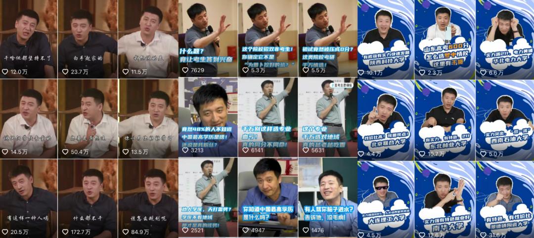 具体来看,该账号共发布1030个视频作品,内容主要可分为3大类:原创内容、直播切片、以及线下演讲金句做成短视频进行二次传播。同时,短视频的封面也越来越规范化。从下图可见(从左到右),该账号视频从早期相对随意的录制状态,到中期视频封面会提炼金句或者亮点吸引用户,再到近期视频封面有统一且颜色明亮的封面、文案以及精心挑选后张雪峰本人的各种表情包。