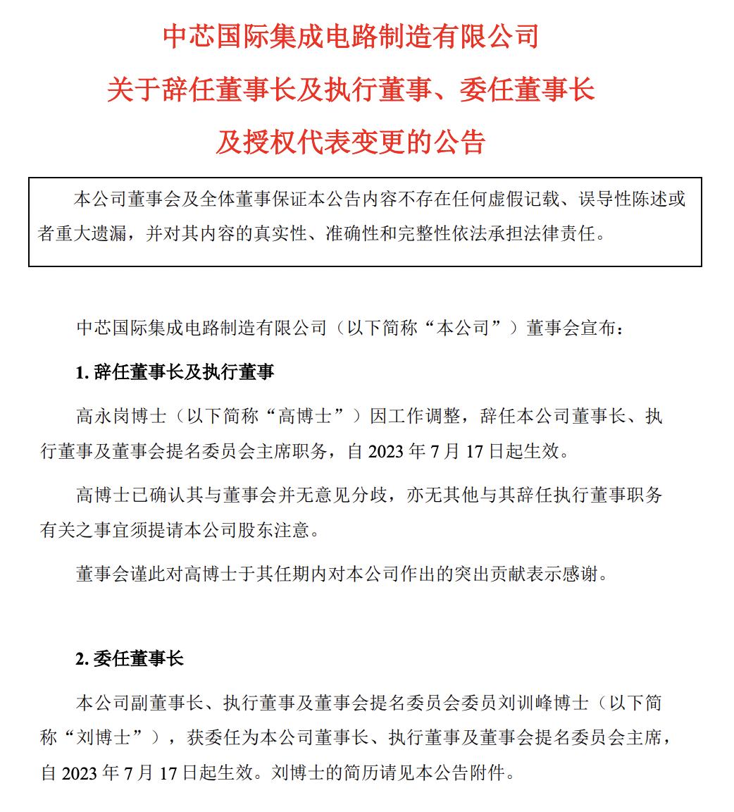 7月17日晚间,中芯国际公告称,高永岗因工作调整,辞任公司董事长、执行董事等职务。公司副董事长、执行董事刘训峰接任董事长一职。上述人事变动自7月17日起生效。
