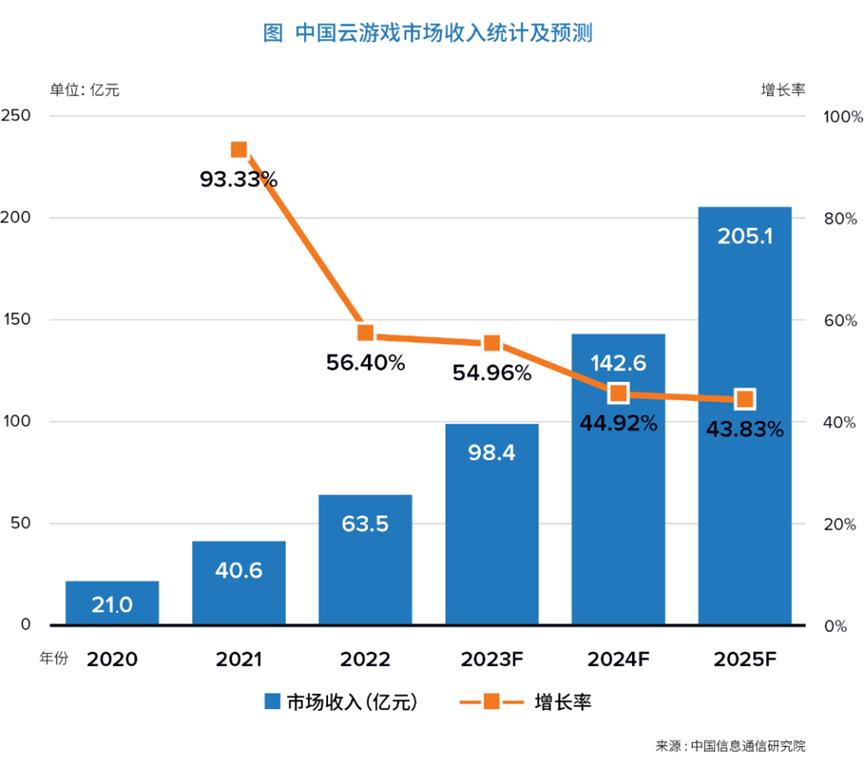 中国信息通信研究院与IDC联合公布的《全球云游戏产业深度观察及趋势研判研究报告(2023年)》指出,中国云游戏市场2022年收入达63.5亿元人民币,同比增长56.4%。预计在2025年达到205亿元,增长势头猛烈。