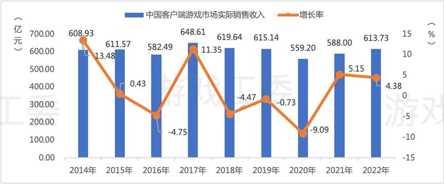 据《2022年中国游戏产业报告》,客户端游戏市场收入为613.73亿元,同比增长4.38%。