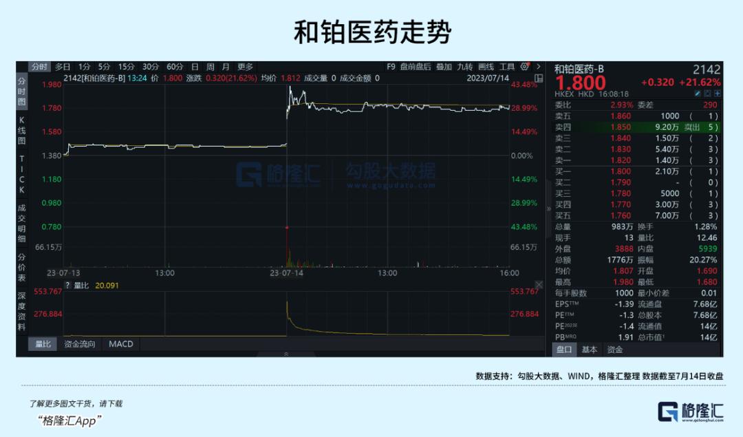 在发布盈喜后次日,和铂医药在资本市场表现格外抢眼。根据WIND数据显示,7月14日开盘,和铂医药跳空高开,全天最高涨幅超30%,自7月初最低点反弹超34%。