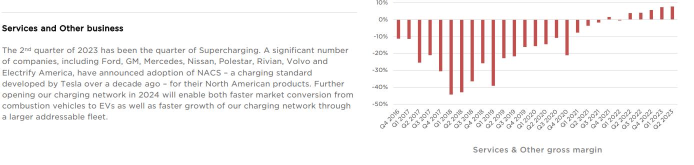 与电动车营收增长相近,包括充电在内的服务收入同比上升47%至21.5亿美元。当然,对于特斯拉来说,今年二季度最值得庆贺的是公司的NACS充电标准已经接近成为“美国国标”,许多国际车企也纷纷投靠特斯拉的超充体系。