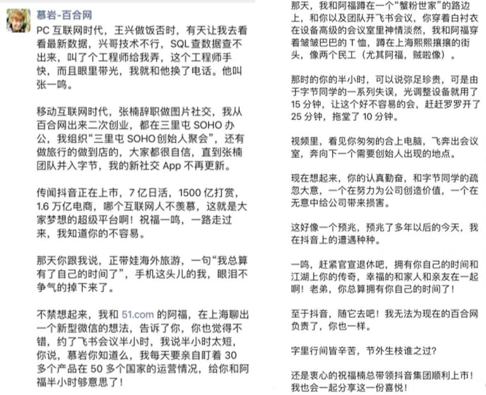 心有千千结,慕岩激烈、激愤、激动得有样学样,在朋友圈里忆往昔峥嵘岁月稠,在号角声里痛陈革命史。规劝张一鸣及时退休的同时,还为抖音列下三大罪状,内容包括抖音无端封号有人提供付费解封,陌生人私信涉黄,给高管和业务人员提建议已读未回。
