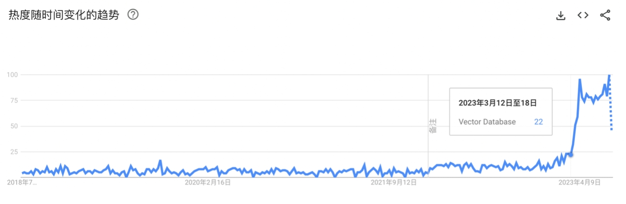 在Google Trends上搜索Vector Database(向量数据库),可以看到从2023年3月之后,全球对其的关注度呈直线上升。