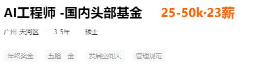 另一家大型基金公司也在招聘机器学习/深度学习,开出25-50K·23薪的有竞争力的薪资。还有基金公司给出60-90K·15薪的更高筹码。