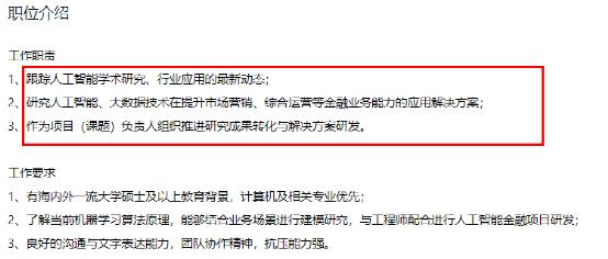 也有公司在实名招聘.。如创金合信基金就在寻找机器学习开发工程师。在工作职责方面,在该岗位任职需要负责机器学习、NLP、OCR、RPA等人工智能技术及算法的研究和应用开发,结合基金业务实际应用场景形成具有竞争力的智能化应用解决方案,并实施落地;跟踪人工智能最新研究成果和技术趋势,适时引入相关技术驱动业务创新。同时,鹏华基金也在招兵买马,实名招聘机器学习工程师。