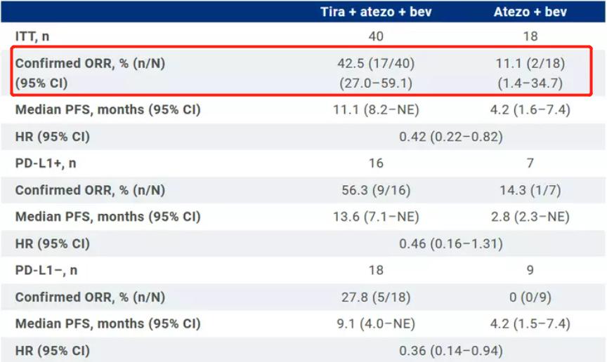 然而,在肺癌适应症中,罗氏的进展却并不顺利,先后在广泛期小细胞癌和非小细胞癌(NSCLC)两大适应症连续失利,这甚至让行业对于TIGIT靶点的前景产生质疑。在残酷的现实面前,头铁的罗氏也不得不低头,在今年ACSO上,罗氏选择将适应症切换至肝癌,并以42.5%的可观缓解率明显优于对照组的11.1%。