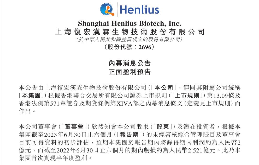 复宏汉霖正面盈利预告显示,受益于核心产品“汉曲优”和创新产品“汉斯状”的增长,预计今年上半年实现利润约2亿元。上年同期,复宏汉霖亏损达2.52亿元。