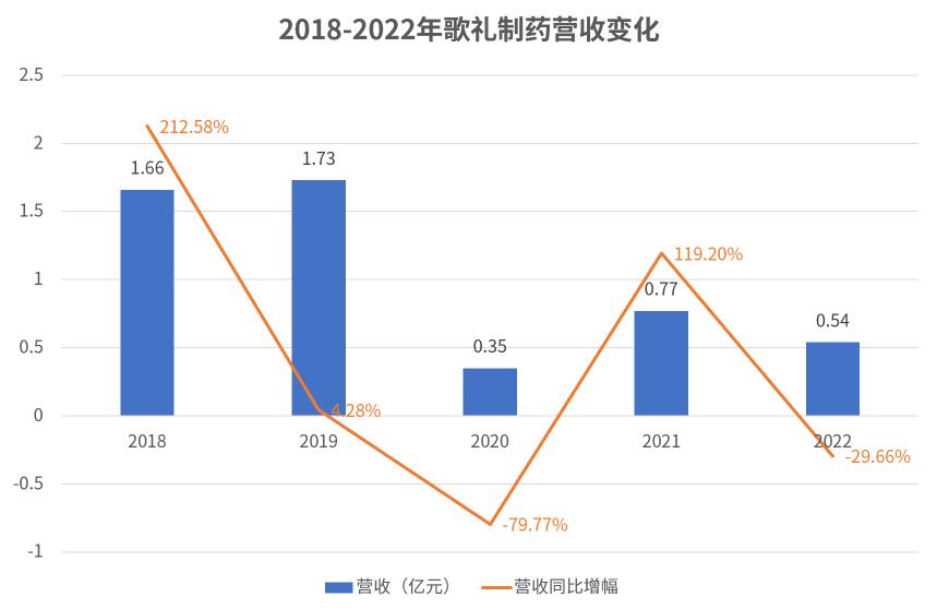 再以头顶“首家18A公司”、“中国本土丙肝第一家”等光环的歌礼制药(01672.HK)为例,2018-2022年,歌礼制药分别实现营收1.66亿元、1.73亿元、0.35亿元、0.77亿元及0.54亿元,同比增幅分别为212.58%、4.28%、-79.77%、119.20%及-29.66%。
