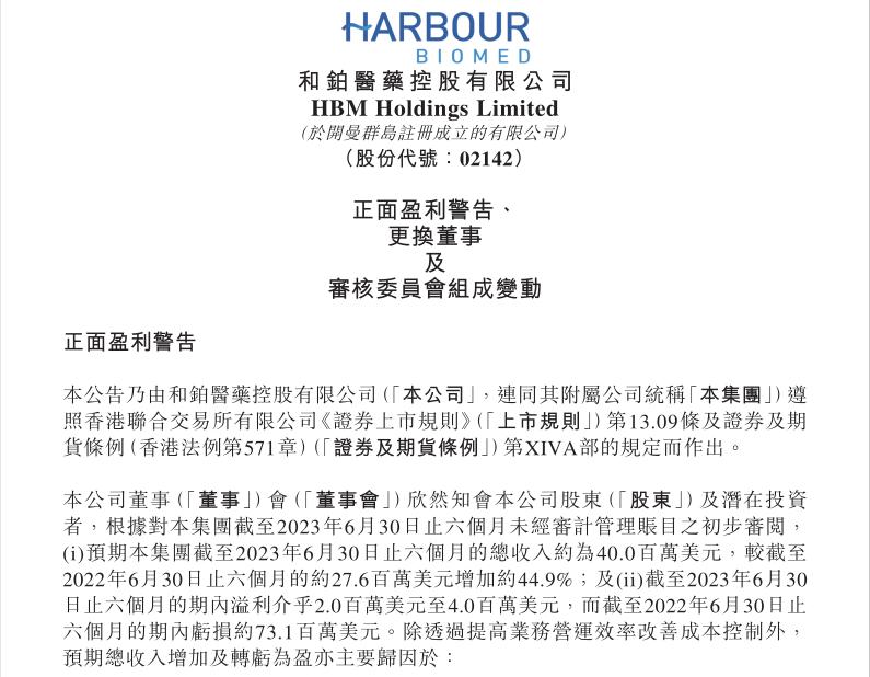 今年上半年,和铂医药再度达成两项重要合作。和铂医药在正面盈利预告中表示,预计上半年实现营收约4000万美元,同比增长44.9%;净利润在200万-400万美元范围内。