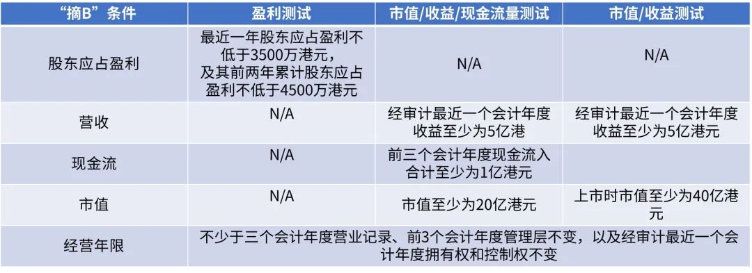 根据港交所规则,只有满足“最近一年股东应占盈利不低于3500万港元,及其前两年累计股东应占盈利不低于4500万港元”、“经审计最近一个会计年度收益至少为5亿港元,前三个会计年度现金流入合计至少为1亿港元,市值至少为20亿港元”、“经审计最近一个会计年度收益至少为5亿港元,上市时市值至少为40亿港元”三个条件之一的,且不少于三个会计年度营业记录、前三个会计年度管理层不变,以及经审计最近一个会计年度拥有权和控制权不变的18A公司才能“摘B”。