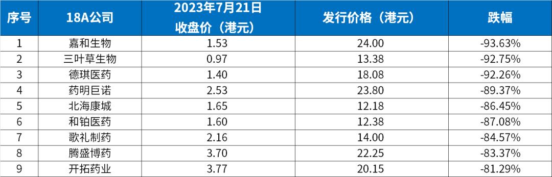 事实上,根据炫氪不完全统计,除歌礼制药外,包括“药名系”药明巨诺(02126.HK)在内的近十家创新药18A公司目前股价处于大幅破发状态,较发行价格缩水80%以上。