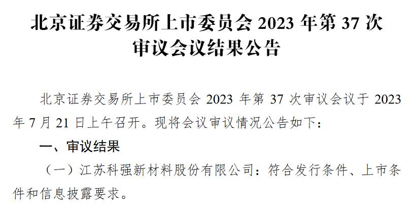北交所官网显示,科强股份申报材料于2023年3月14日获受理,2023年6月26日完成二轮问询回复,7月21日过会。