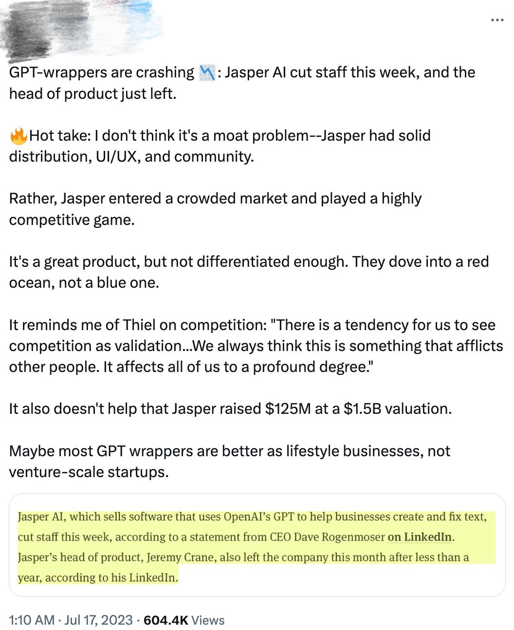 关于其裁员背后成因的讨论过去一周仍在持续升温。有人将其归咎于Jasper与OpenAI的重度绑定关系,有人认为创企在属于巨头游戏的生成式AI竞赛中毫无优势,还有些悲观论调将此视作生成式AI裁员潮的序幕。