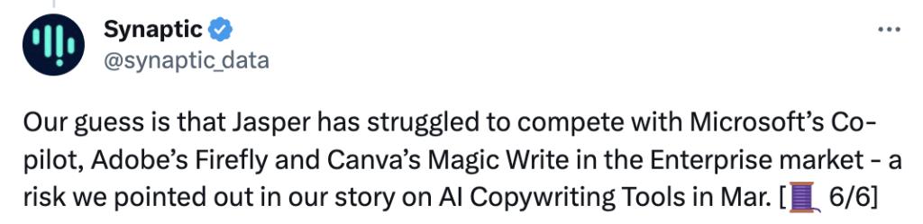 市场洞察公司Synaptic认为,Jasper的产品难以与微软的Copilot、Adobe的图像视频编辑工具Firefly等产品抗衡。