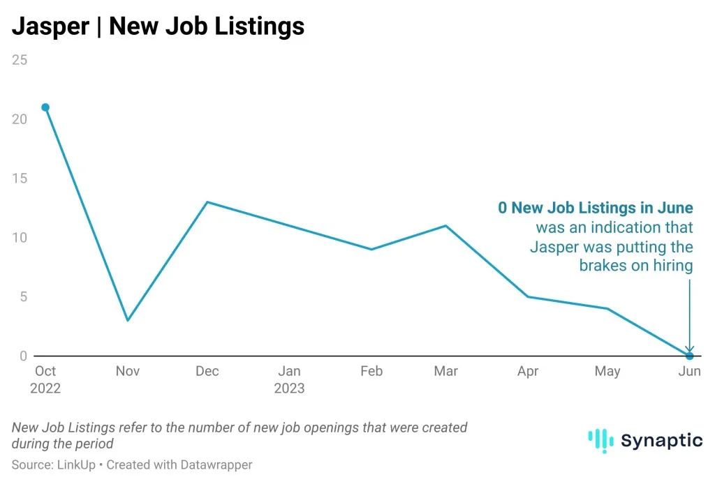 Jasper的裁员计划也早显端倪。市场洞察公司Synaptic的数据显示,去年10月拿到1.25亿美元融资至今,Jasper的员工人数增加了约140%。从今年3月开始,Jasper的新岗位招聘数量就直线下滑,直到今年6月降为0。其官网显示,Jasper目前的在招职位仅剩两个。